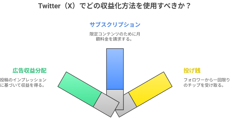 Twitter(X)で用意されている主な収益化手段は、以下の3種類に大別できます。