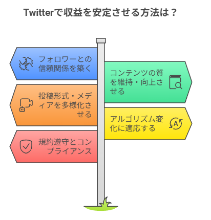 以上のポイントを押さえて運用することで、フォロワー数やインプレッション数の波があっても底が抜けない安定したエンゲージメントを築けるはずです。収益化後も慢心せず研鑽を積み、「フォロワーに価値を与え続ける限り収入は後からついてくる」くらいの姿勢で臨むのが成功のコツと言えるでしょう。