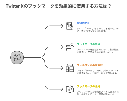 以上のポイントを意識すれば、ブックマーク機能をより安全に、そして便利に使いこなせるでしょう。「ブックマーク=保存して終わり」ではなく、使い倒してTwitterを自分の情報アーカイブにするくらいの勢いで活用してみてください。