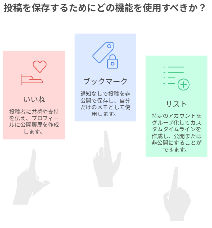 ブックマークと混同されやすい機能に「いいね」や「リスト」があります。