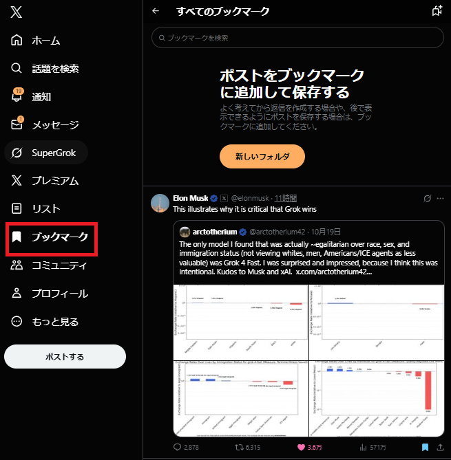 ただし、機能追加やUI改善の余地はあります。事実、2023年にはブックマークボタンの配置変更やブックマーク数の表示といったアップデートが行われました。イーロン・マスク氏は「ブックマークをカテゴリ別にフォルダ分けできるようにする」構想も示唆していました。2025年現在その機能はまだ実装されていませんが、今後フォルダ分けや並び替えなど利便性向上のアップデートがあるかもしれません。