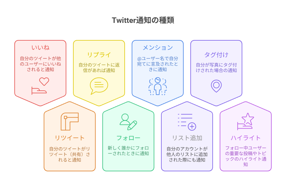 Twitterでは以下のようなユーザーのアクションに応じて通知が届く仕組みになっています。