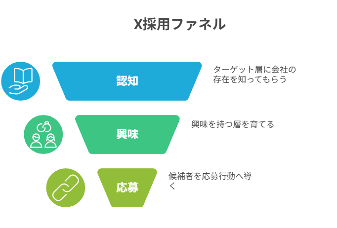 それでは、Twitter(X)を使ってどのように候補者の母集団を形成し、採用成功につなげるか、その仕組み作りとポイントを解説します。ただ闇雲に投稿するだけでなく、「認知→興味→応募」という候補者の導線を意識した設計が重要です。また単にフォロワー数を追うのでなく、関係性構築を重視すべき理由についても述べます。