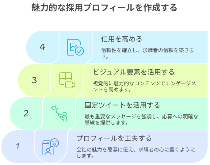 以上を踏まえてプロフィールと固定投稿を充実させれば、訪問者が「この会社いいかも」と感じフォローや応募行動につながりやすくなります。