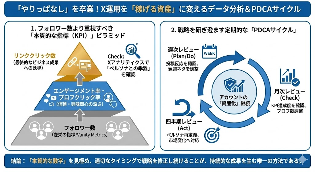 - 四半期レビュー: ペルソナ設定そのものが市場の動きとズレていないか再定義する。 このサイクルを回すことで、アカウントは時代遅れになることなく、常に「稼げる資産」であり続けます。