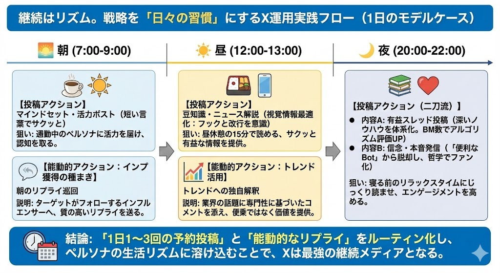 戦略を策定した後は、それを日々のアクションに落とし込むフローが必要です。Xは「継続のメディア」であり、リズムを構築した者が勝ちます。