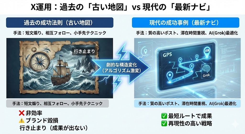 Xのプラットフォーム環境は、ここ数年で劇的な構造変化を遂げました。過去の成功法則に固執することは、非効率なだけでなく、ブランドを毀損するリスクさえ孕んでいます。最新の成功事例を学ぶことは、最短ルートで成果を出すための「現代の地図」を手に入れることに他なりません。