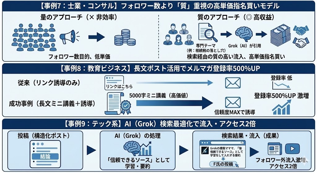 相続専門の弁護士であるD氏は、フォロワー数を増やすことを目的とせず、富裕層が検索しそうな「相続税の落とし穴」というディープな専門テーマに特化しました。 Grokが「相続の専門家」としてD氏のポストを頻繁に引用するようになり、検索経由で流入するユーザーの質が劇的に向上。結果として、数千人という小規模なフォロワー数ながら、1件あたりの成約単価が非常に高い「指名買い」の相談が絶えない、高収益なビジネスモデルを実現しました。