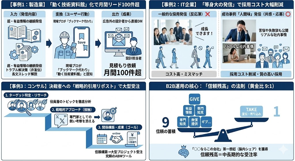 経営コンサルティングを行うB社は、ターゲット企業の役員層がXでどのようなトピックに反応しているかを徹底的にリサーチしました。 相手の投稿に対して、単なる賞賛ではなく、専門家としての鋭い考察を添えた「引用リポスト」を戦略的に実施。数ヶ月にわたる「オンライン上の接点構築」の結果、相手から「一度、弊社の経営課題について意見を聞かせてほしい」と誘いを受け、1件数億円規模の長期プロジェクトの受注に成功しました。これは、Xが「究極のABM(アカウント・ベースド・マーケティング)ツール」であることを示しています。