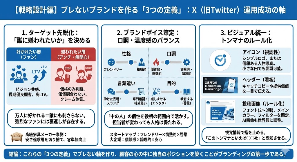 Xにおけるブランディングでは、「誰に好かれたいか(ペルソナ)」を決めるのと同時に、「誰に嫌われたいか」を明確にすることが重要です。