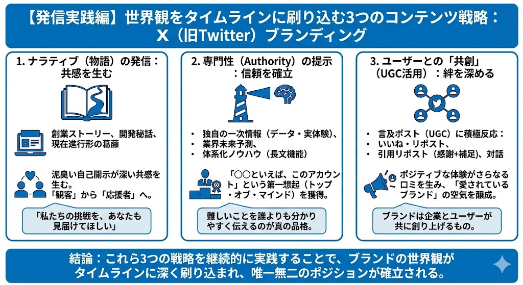 戦略が決まれば、次は実践です。定義したブランドの世界観を、日々の投稿を通じてユーザーの脳内に刷り込んでいきます。ここでは、ブランディングに直結する3つのコンテンツ戦略を紹介します。