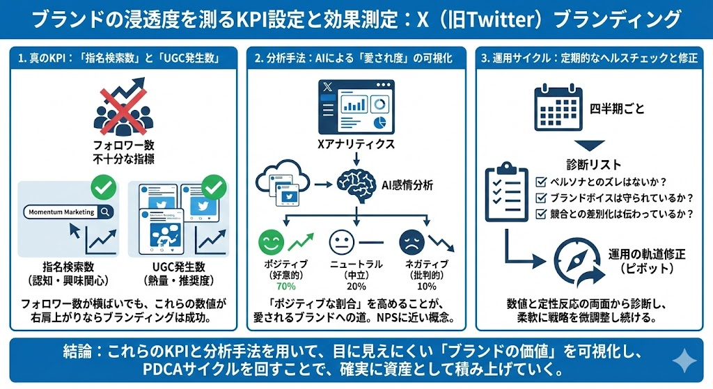 Twitter(X)におけるブランディング戦略について、その重要性から実践手法、リスク管理までを解説してきました。