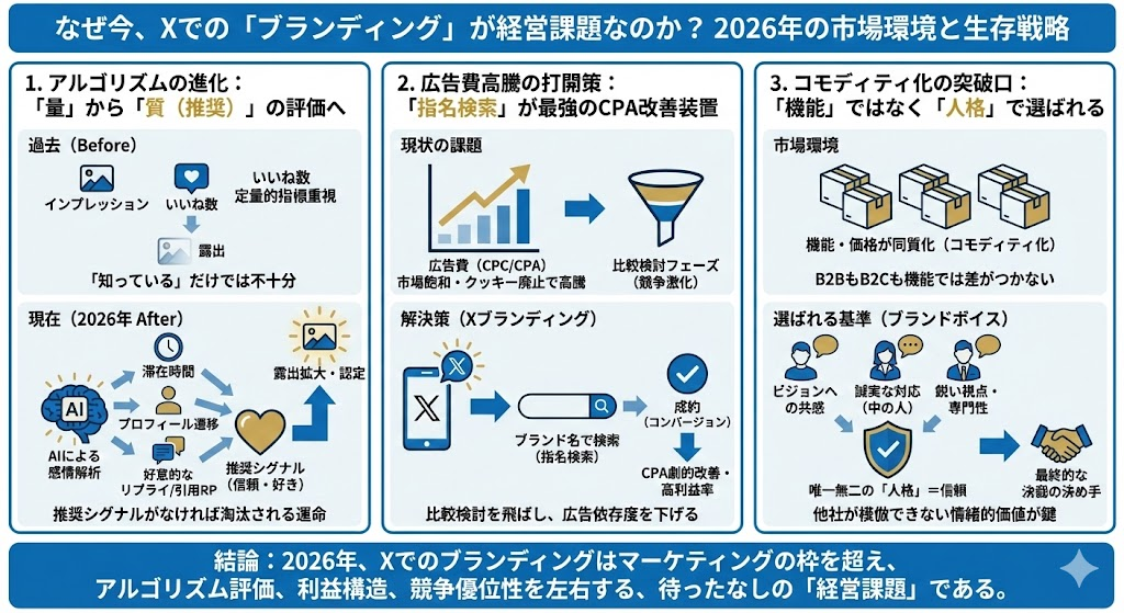 なぜ今、Xでのブランディングが、マーケティング担当者だけでなく経営レベルで取り組むべき最重要課題となっているのか。その背景には、2026年特有の市場環境とテクノロジーの進化があります。