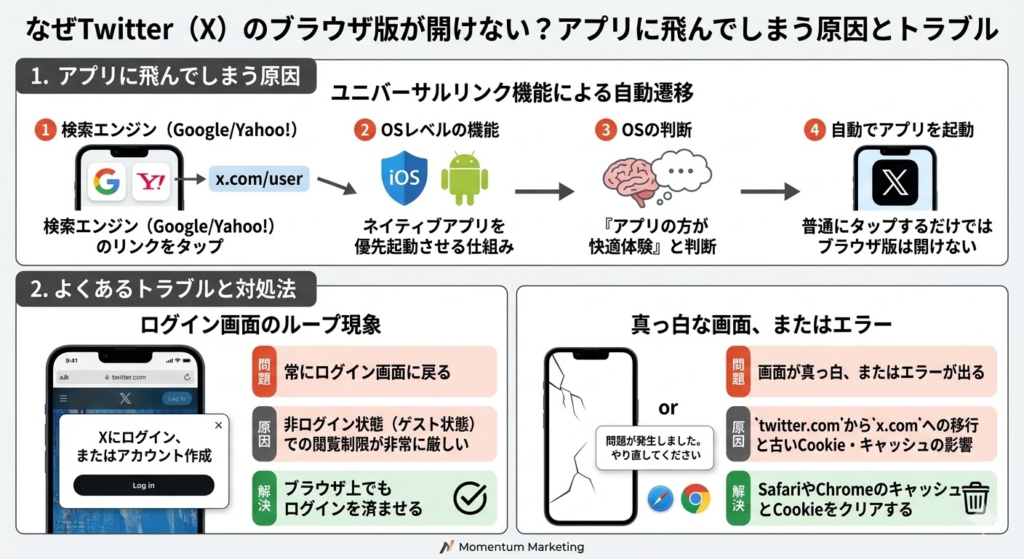 【2026年最新】Twitter(X)ブラウザ版の開き方|アプリが勝手に開く原因とスマホ(iPhone/Android)での対処法