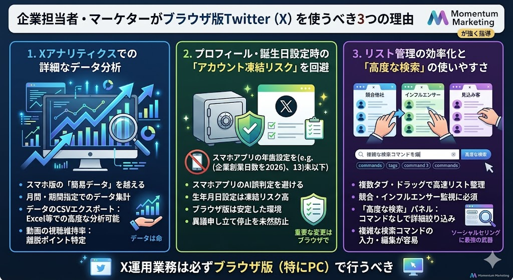 ここまで、スマホおよびPCでブラウザ版のXを開く技術的な手順を解説してきました。しかし、そもそもなぜ「わざわざブラウザ版を開く必要があるのか?」と疑問に思う方もいるかもしれません。 スマホアプリは閲覧や簡単な投稿には優れていますが、企業のマーケティング活動においては機能不足です。ここでは、弊社Momentum Marketingがクライアント企業に対して「運用業務は必ずブラウザ版(特にPC)で行うべき」と強く指導している3つの明確な理由を解説します。