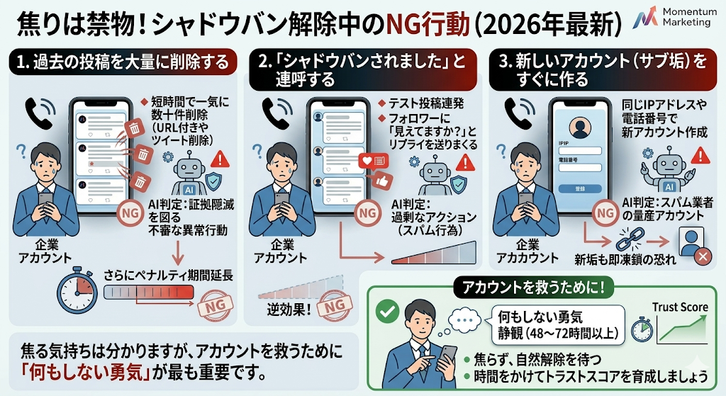 焦る気持ちは痛いほど分かりますが、アカウントを救うためには「何もしない勇気」を持つことが最も重要です。