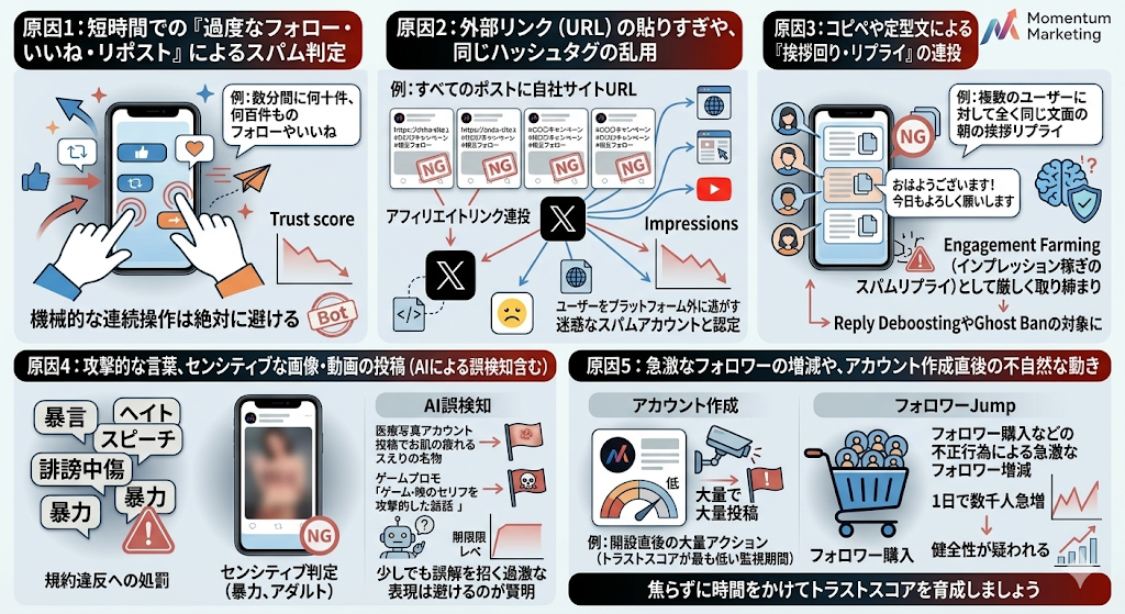 シャドウバンは、Xのアルゴリズム(AI)があなたのアカウントを「スパム」や「質の低いコンテンツ発信者」と見なした結果として引き起こされます。では、具体的にどのような行動がAIの逆鱗に触れるのでしょうか。2026年最新の傾向に基づく、5つの主な原因を解説します。