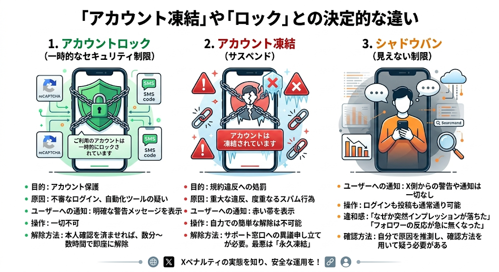 Xのペナルティには、シャドウバンの他にも「アカウント凍結(サスペンド)」や「アカウントロック」があります。これらは性質が全く異なります。