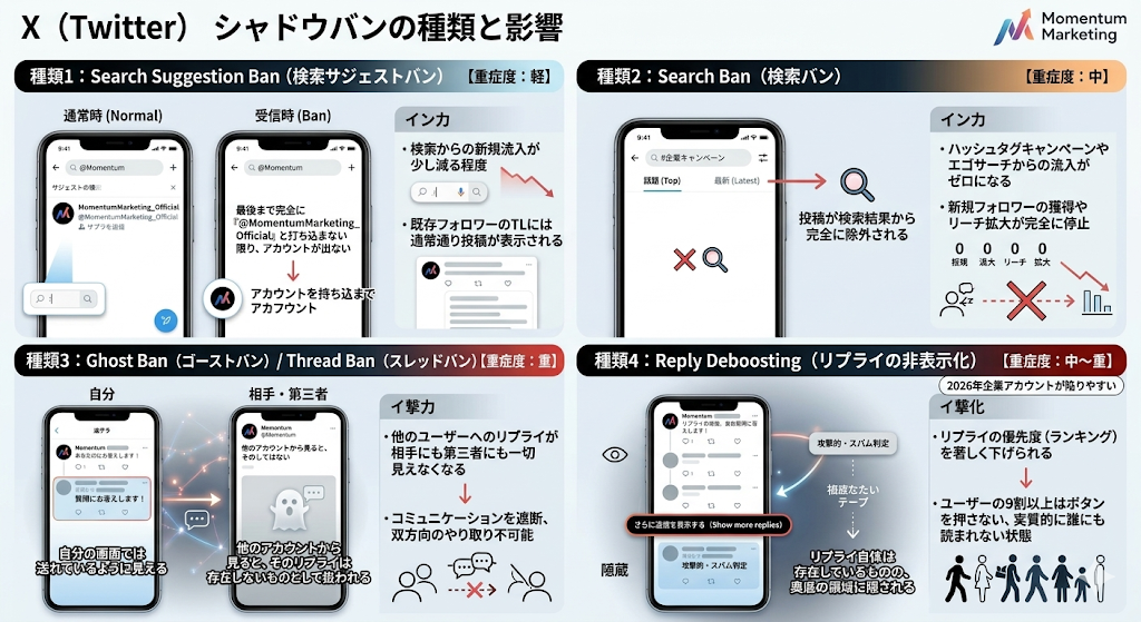 【重症度:中】 これは文字通り、あなたの投稿が「Xの検索結果から完全に除外される」重いペナルティです。