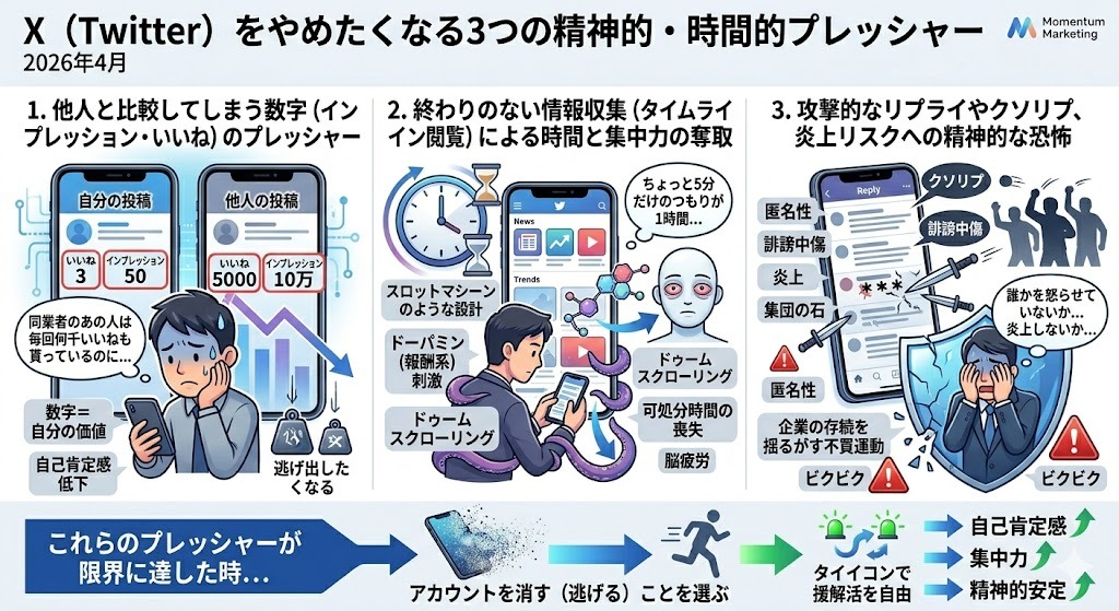X運用コンサルティングおよび実行支援を行っている弊社「Momentum Marketing(モメンタムマーケティング)」にも、企業のWeb担当者様から「インプレッションが伸びないプレッシャーで夜も眠れない」「炎上が怖くて、もう運用をやめたい」という悲痛なご相談が毎日のように寄せられます。SNSは本来、人と繋がり、ビジネスを加速させるための便利なツールであるはずが、いつの間にか私たちの心を削る刃となってしまっているケースが非常に多いのです。